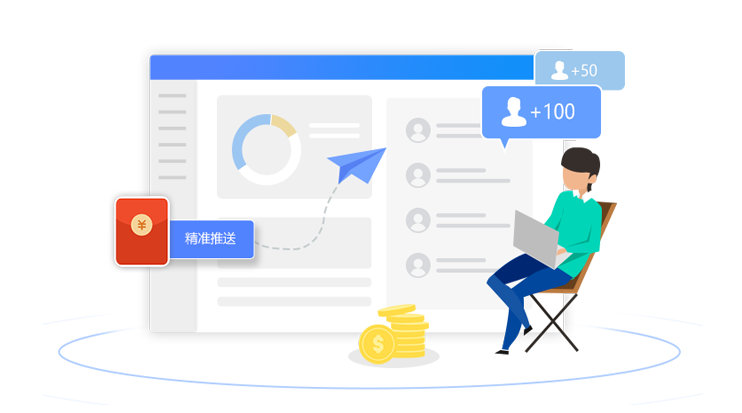 支持對海量的客戶以及客戶群,推送消息、甚至小程序、優惠券等,并可追蹤效果。